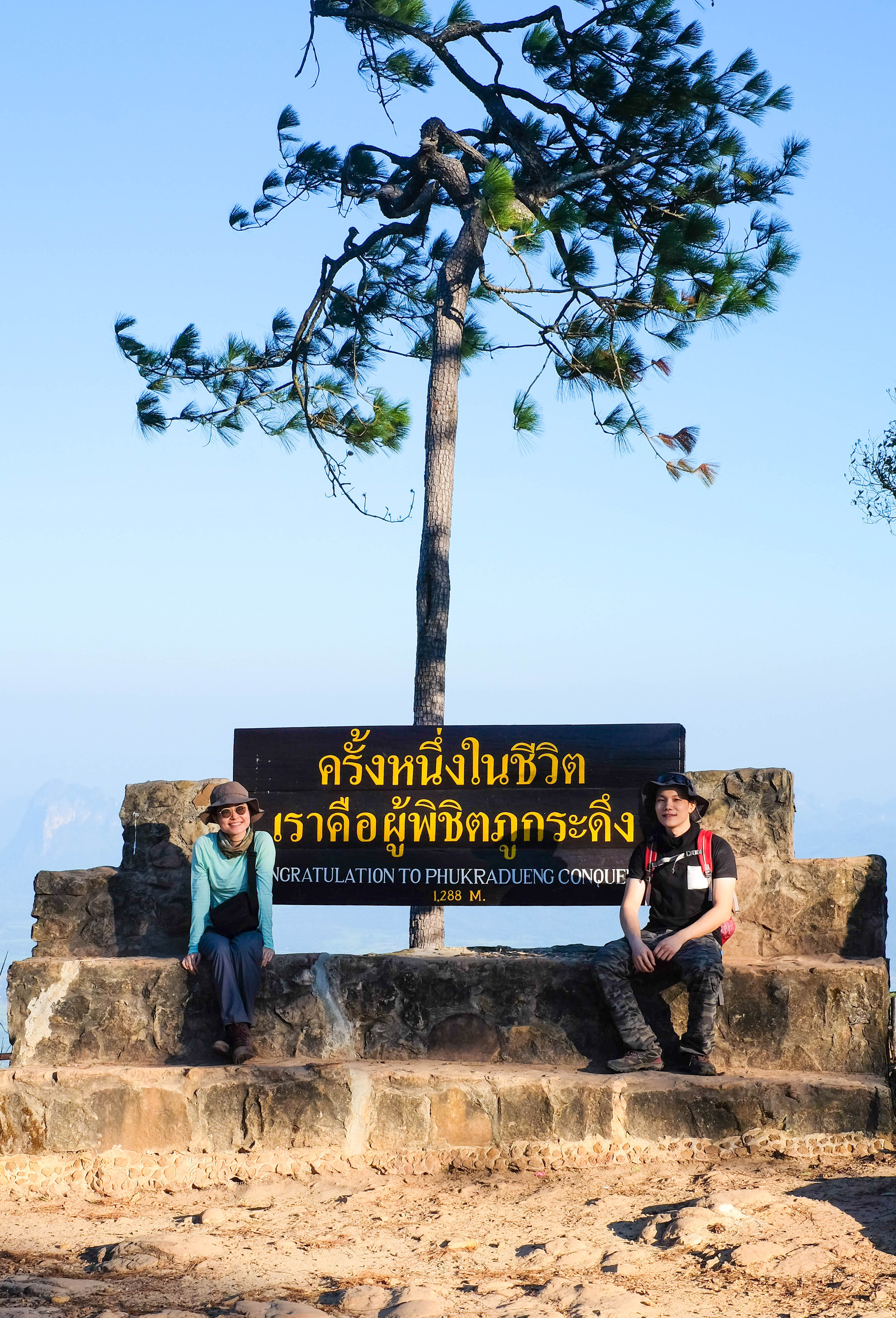 เราสองคนเดินมาถึงหลังแป จุดถ่ายรูปกับป้าย ครั้งหนึ่งในชีวิต เราคือผู้พิชิตผู้กระดึง ตอนสี่โมงครึ่ง จากประสบการณ์ครั้งที่แล้วจำได้ว่าพอถึงหลังแปแล้วต้องเดินต่อ 3 กม.นี่ร้อนมาก เพราะไม่มีร่มเงาไม้เลย ครั้งนี้เห็นมีจุดเช่าจักรยานอยู่ เลยตัดสินใจได้ง่ายๆควักเงิน 60 บาท จ่ายไปเพราะหวังว่าจะสบายขึ้น ปรากฎว่าไม่รู้คิดถูกหรือคิดผิด ทางขี่จักรยานก็ไม่ได้ขี่ง่ายๆ ขรุขระตลอดทาง ช่วงที่เป็นทางลง ก็เร็วซะจนหวาดเสียว เพราะสภาพของจักรยานก็ดูไม่น่าไว้วางใจเท่าไหร่ แต่พอช่วงที่เป็นทางขึ้นก็ขี่ยากสุด เป็นจุดเริ่มต้นของการปวดกล้ามเนื้อหน้าขาสุดๆ ข้อดีอย่างเดียวก็คือไม่ร้อน เพราะลมพัดตลอดจากความเร็วของจักรยาน ทำให้หนาวจนน้ำมูกไหลเลย แม้ว่าจะเอาบัฟปิดหน้าไปแล้ว ขี่ไปสักพักก็เริ่มรู้สึกว่าทำไมมันนานผิดปกติ แล้วทางก็ดูไม่คุ้นจากครั้งที่แล้ว เห็นคนเดินย้อนมาสองสามกลุ่ม เลยต้องถามเพื่อความแน่ใจ สุดท้ายก็คือมาถูกทางแล้ว แต่เพิ่งรู้ว่าระยะเพิ่มมาอีกกิโลนึง เพราะเป็นคนละเส้นทางกับเส้นทางเดิน