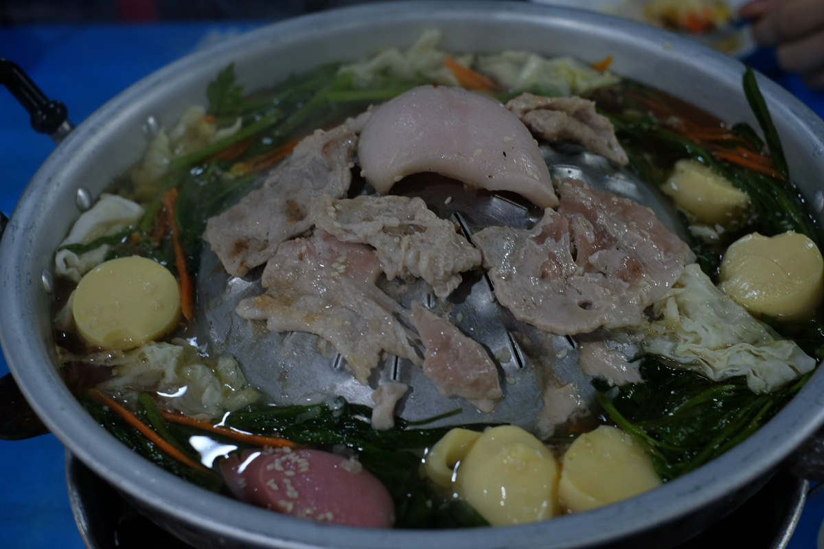 พวกเราเดินไปหาลูกหาบ ตามคาดกระเป๋ายังไม่มา แต่ไม่เป็นไรเพราะพวกเราวางแผนเอาผ้าเช็ดตัว เครื่องอาบน้ำ และชุดมาเปลี่ยนเรียบร้อย ทำให้อาบน้ำได้เลย ไม่ต้องรอกระเป๋า ซึ่งถือเป็นความโชคดี เพราะอากาศเย็นลงอย่างรวดเร็ว น้ำเย็นมาก กว่าจะอาบได้ ต้องยืนทำใจอยู่นาน อาบเสร็จกลับมาที่เต็นท์ประมาณหกโมง อากาศหนาวแล้ว ใส่เสื้อหนาว เดินจากเต็นท์ไปแวะดูกระเป๋า ก็ยังไม่มา เลยเดินเลยต่อไปกินข้าวเย็นเลย ตามธรรมเนียมข้าวเย็นมื้อแรก จะเป็นอะไรไปไม่ได้ นอกจากหมูกระทะ ครั้งนี้กินร้านใบเฟิร์นซึ่งอยู่ค่อนมาทางด้านหลังหน่อย เพราะร้านต้นๆคนค่อนข้างเยอะ นั่งเป็นลูกค้าคนแรกของร้านเลย หมูกระทะ 500 บาท ปริมาณเยอะตามราคา มีแถมข้าวผัดฟรี พี่เจ้าของร้านใจดี ชวนพูดคุยตามอัธยาศัยแม่ค้าภูกระดึง ก่อนกลับซื้อน้ำขวดใหญ่กับพี่เค้า พี่เค้าให้ยืมถุงผ้ามา แม้ว่าเรายืนยันกันว่าจะไม่เอา เพราะกลัวลืมเอามาคืน พี่เค้าก็บอกไม่เป็นไร ลืมก็ให้เอากลับไปเลย