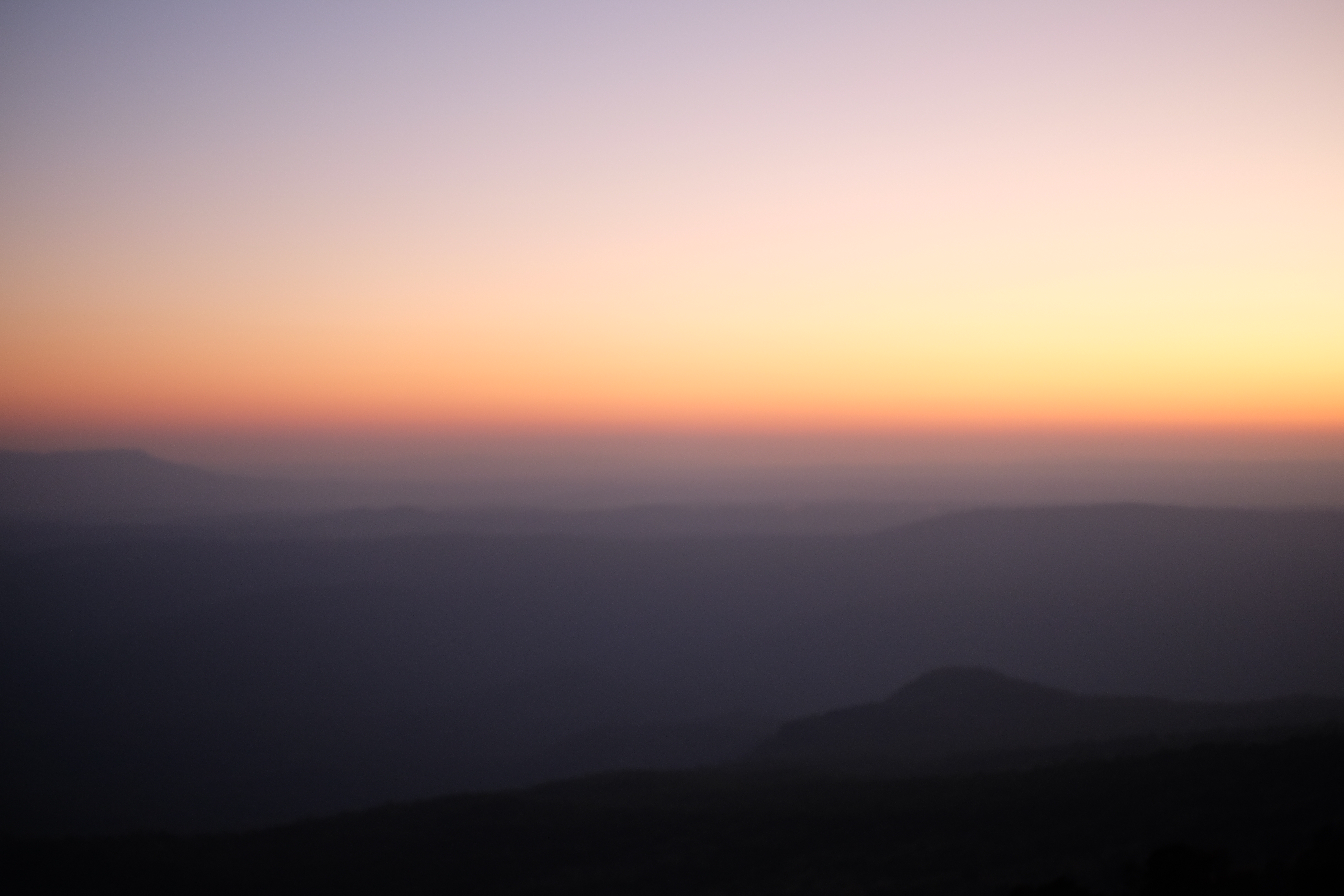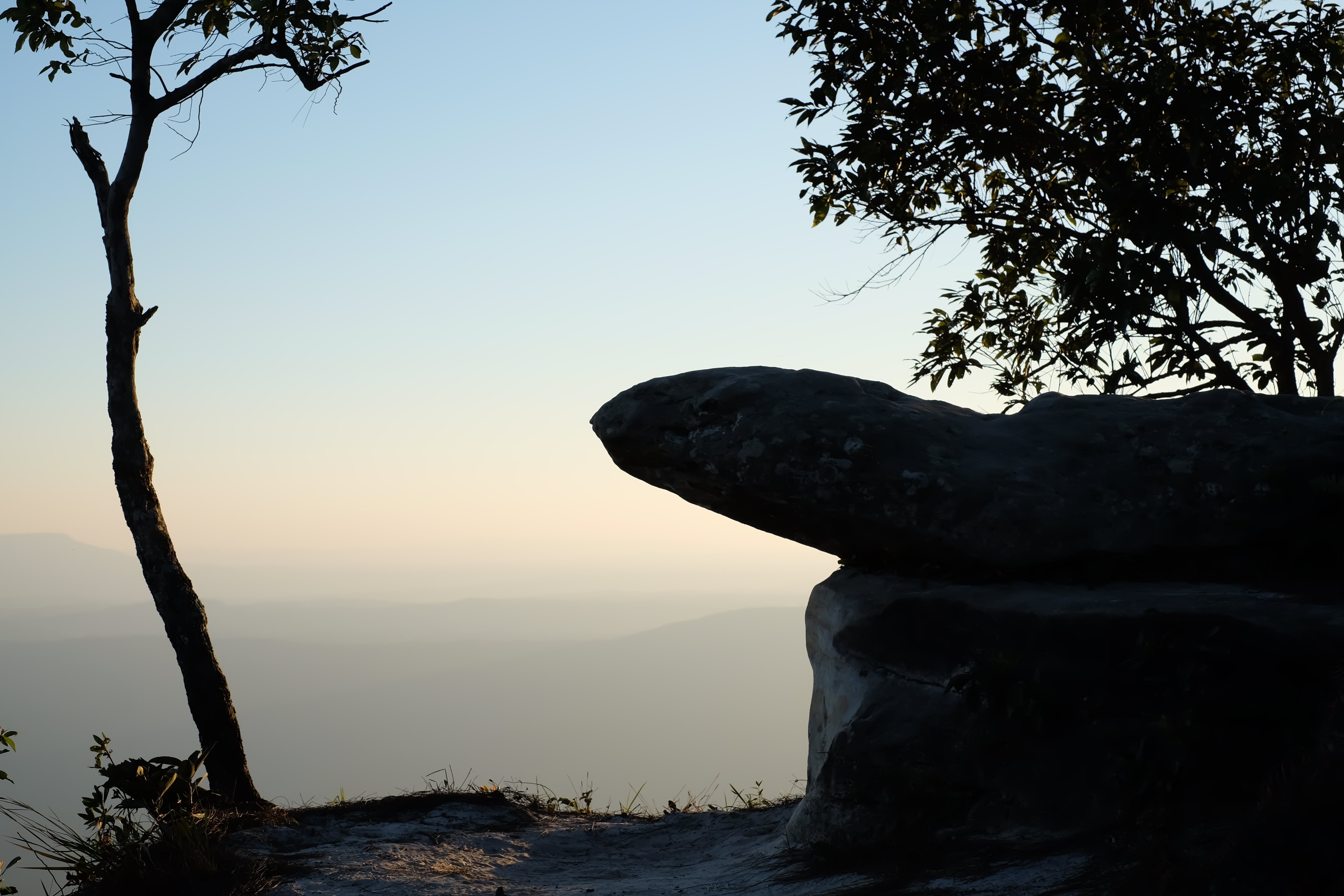 เดินมาถึงผานกแอ่นประมาณหกโมงนิดหน่อย เห็นนักท่องเที่ยวมารออยู่ก่อนหน้าพอสมควร ไม่เยอะมาก พอมีที่เหลือให้ตั้งกล้องถ่ายรูปได้อย่างสบายๆ มองไปที่ท้องฟ้า ฟ้าสว่าง เห็นแสงอาทิตย์อยู่ไรๆ ยืนไม่ถึงห้านาที เจ้าหน้าที่ตะโกนบอก ขึ้นแล้วนะครับ ก็เห็นพระอาทิตย์โผล่พ้นเส้นขอบฟ้าพอดี สองคนมองหน้ากันบอกเป็นไงมาพอดีเลย ไม่ต้องมารอเหมือนคนอื่น หารู้ไม่ว่าก่อนหน้า พลาดหมอก พลาดแสงสวยๆอะไรไปบ้าง ยืนถ่ายรูปเล่น กินโอวัลตินที่เจ้าหน้าที่มาตั้งโต๊ะขายอยู่พักใหญ่ ก็เดินกลับ
