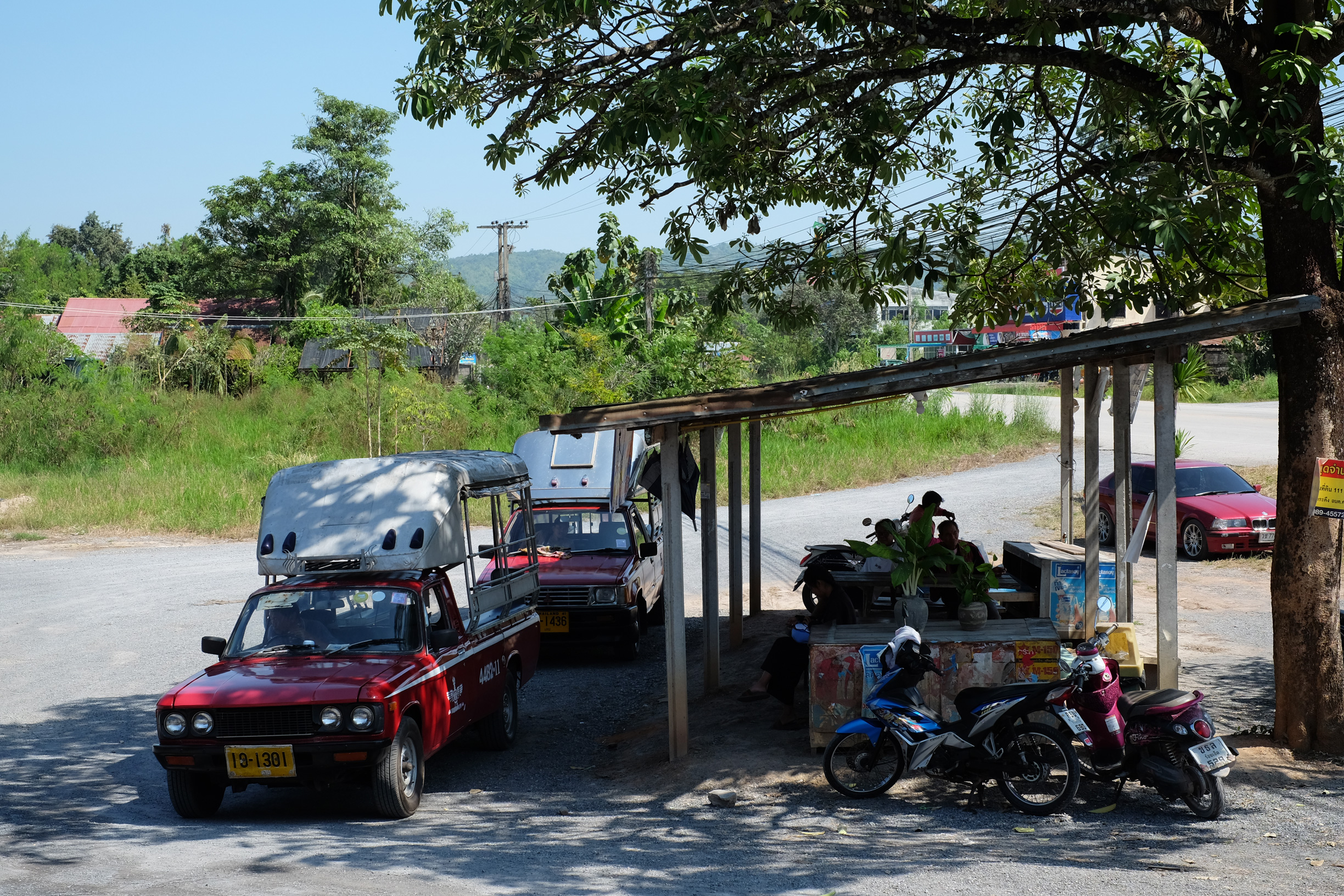 ในที่สุดประมาณเกือบเที่ยงครึ่ง รถก็ผ่านหน้าร้านเจ้กิม จุดนี้ก็เงียบๆ มึคนลงแค่คนสองคน นั่งต่อไปอีกนิดนึง ก็ถึงจุดลงของภูกระดึง การนั่งรถทัวร์นี้ไม่มีการบอกว่าถึงไหนแล้ว เหมือนทุกคนจะรู้ได้เองว่าต้องลงจุดไหน ถึงเราสองคนจะมีบอกกระเป๋ารถว่าถ้าถึงแล้วให้ช่วยมาบอก แต่ก็ไม่มีการกระทำนั้นเกิดขึ้น โชคดีที่มี Google Maps ทำให้พวกเราดูได้ว่าถึงจุดไหน จุดนี้มีคนลงมาพร้อมเราอีกสองคน เรารีบเดินเข้าไปถามว่าเค้าไปภูกระดึงรึป่าว แอบดีใจตอนเค้าบอกว่าไป เพราะมีคนหารค่ารถด้วย มาถึงเจอคุณป้าเจ้าของร้าน พยายามถามไถ่ว่ากินข้าวมารึยัง มีข้าวกระเพรานะ เพิ่งทำเสร็จใหม่ๆ เราก็บอกคุณป้าไปว่ากินมาแล้ว พร้อมไปเลย คุณป้าเจ้าของร้านบอกว่าค่ารถ 240 บาท ให้หารกันสี่คน พวกเราขอเข้าห้องน้ำก่อน พอเดินออกมาคุณป้าก็ถามว่ากินข้าวมั๊ย ข้าวกระเพราเพิ่งทำเสร็จใหม่ๆ ประหนึ่งเพิ่งเจอหน้ากัน ระหว่างนั่งรอ ที่ไม่รู้ว่ารออะไร ก็มีรถทัวร์มาจอด ทำให้มีอีกสองคนมาหารค่ารถเพิ่ม คุณป้าเรียกรถมาให้ ออกเดินทางด้วยราคาคนละ 40 บาท