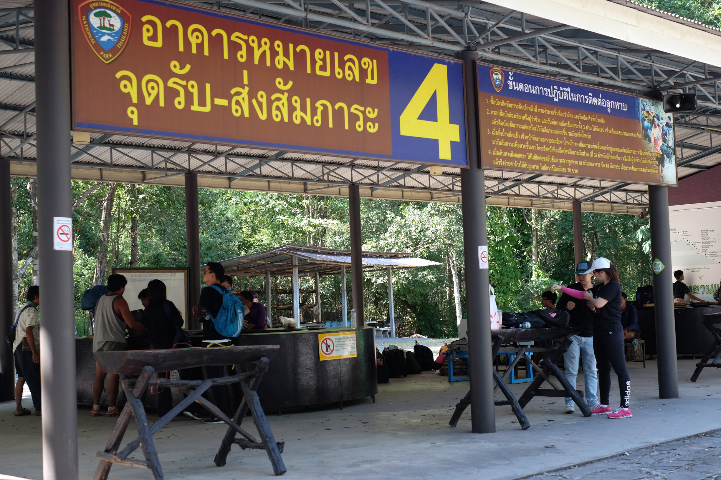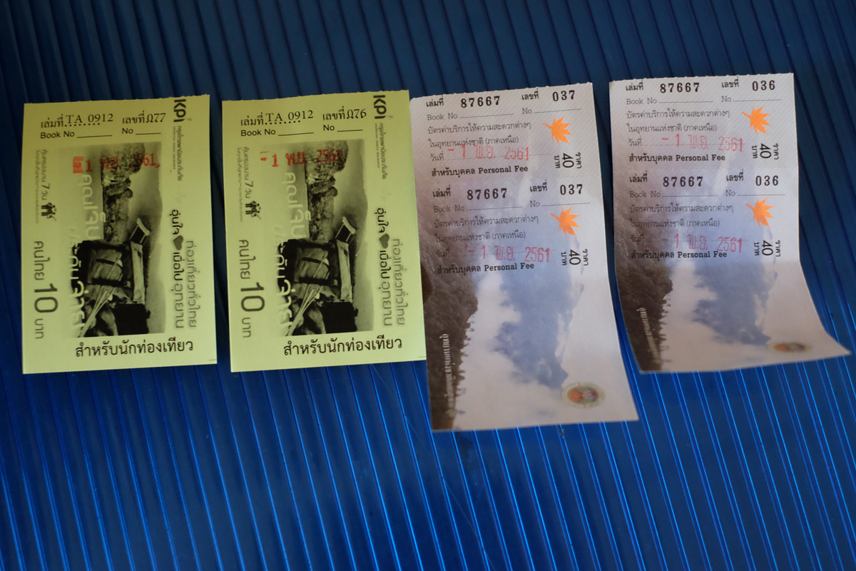 ขับไปไม่ถึงสิบนาทีก็มาถึงหน้าอุทยานฯ มีการเก็บค่าเข้าอุทยานฯคนละ 40 บาท จากนั้นไปถึงที่ทำการ ก็จะมีการเรียกเก็บค่าใช้พื้นที่บริการเต็นท์อีกคนละ 30 บาท ค่าประกันอุบัติเหตุ 10 บาท ณ จุดนี้ได้ใบเสร็จมารวมกันสองคน หกใบแล้ว ทุกการจ่ายเงินเจ้าหน้าที่จะบอกให้เก็บบัตรเอาไว้ด้วยนะคะ แถมบอกให้ถ่ายรูปไว้ด้วย น่าจะเป็นห่วงเรื่องตอนเคลมประกัน เดี๋ยวหลักฐานจะไม่ครบ เป็นการเก็บแบบกระปิดกระปอยสุดๆ ก่อนจะไปด่านจ่ายเงินต่อไป สิ่งที่ไม่ลืมทำคือการเอาสมุดอุทยานฯออกมาขอตราประทับจากเจ้าหน้าที่ ปั๊มเสร็จก็แต่งตัว ใส่หมวก ทาครีมกันแดด แล้วก็ไปยังจุดจ่ายเงินต่อไป ค่าบัตรกระเป๋า ใบละ 5 บาท อันนี้ก็จะได้บัตรมา ส่วนนึงติดกระเป๋า ส่วนนึงเก็บไว้ เป็นการสะสมกระดาษก่อนขึ้นภู ส่วนค่าลูกหาบที่กิโลละ 30 บาท เค้าบอกให้จ่ายตรงกับลูกหาบ ตอนที่ขึ้นไปรับของด้านบน กระเป๋าใบใหญ่ของพวกเราสิบกิโลพอดี ส่วนใบเล็กอีกห้ากิโลแบกไปเอง