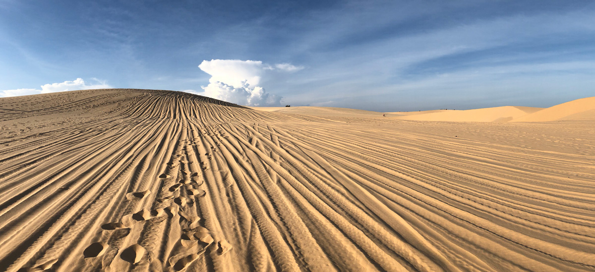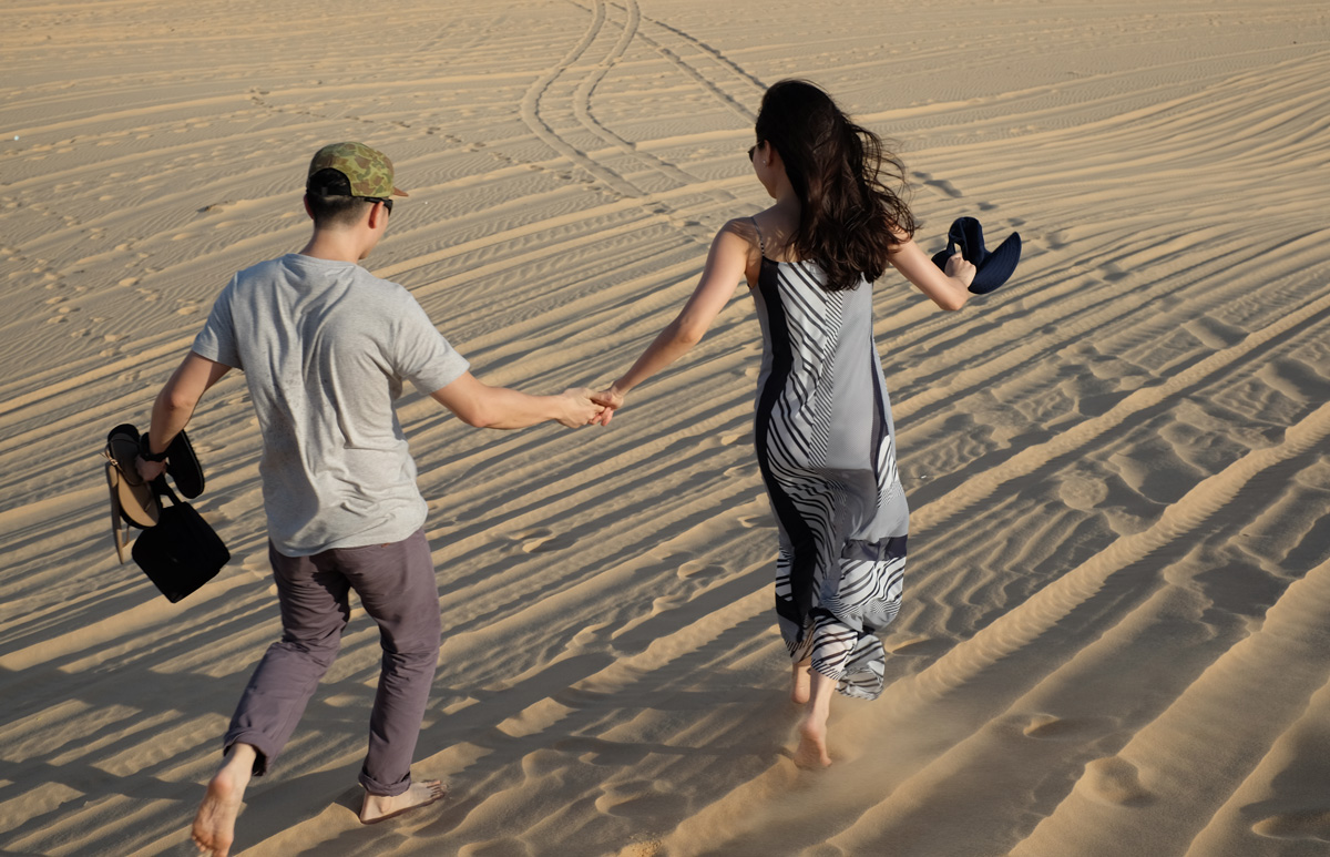 จุดแรกที่แวะคือ White Sand Dune ซึ่งเป็นจุดที่อยู่ไกลจากโรงแรมมากสุดประมาณ 30 กม. จุดนี้มีเสียค่าเข้าชม คนละ 15,000 ดอง พอเข้าไปแท๊กซี่บอกเราว่าจะจอดรออยู่ตรงนี้ ให้เวลาเราประมาณชั่วโมงนึง ตรงนี้จะมีคนมาชวนให้เช่ารถ ATV บอกว่าคันนึงนั่งได้ 2 คน คิดคันละ 1.2 ล้านดอง พาไปทั่วๆประมาณครึ่งชั่วโมง พร้อมกับบอกว่าเดินเที่ยวเองก็ดูได้ไม่ครบนะ เพราะที่นี่กว้างมาก ต้องนั่ง ATV อย่างเดียวถึงจะครบ เดี๋ยวจะพาไปจุดชมวิวที่ยอดเลย พวกเราคุยกันว่า 1.2 ล้านดองนี่มันแพงมากเลย ประกอบกับพวกเราก็เฉยๆไม่ได้อย่างเล่นอะไรมาก ก็เลยไม่ได้สนใจมาก คนขายก็เริ่มลดราคาลงมาให้เอง ตอนแรกบอกล้านดอง พวกเราก็บอกไม่เอา เราลองต่อมั่วๆไปบอกว่า 5 แสนดอง เค้าก็ไม่ให้ สุดท้ายลดให้ที่ 8 แสนดอง แต่พวกเราก็ไม่เอาอยู่ดี สุดท้ายก็คือ เดินไปกันเอง จริงๆก็คือจริงอย่างเค้าว่า ว่าที่มันกว้างมากเดินเองไม่ครบแน่ๆ แต่จริงๆคิดว่าไม่ได้จำเป็นต้องเดินให้ครบ เพราะมันก็สวย แล้วก็ดูเหมือนกันทุกจุด พวกเราเดิน วิ่งเล่นด้วยความสนุกสนาน ทรายนุ่ม ละเอียดมาก ถึงแม้แดดจะแรงมาก แต่ก็ไม่ได้ร้อนมากเพราะมีลมพัดผ่านมาเรื่อยๆ จุดนี้สิ่งที่ต้องระวังมีอย่างเดียวคือ ATV คือเค้าจะขับกันมาเร็วมาก แต่ก็จะเป็นพวกพนักงานของที่เช่า ATV ที่เป็นคนขับ บางทีมันเป็นเนิน เค้าขับมาจากเนินอีกฝั่งก็ไม่เห็นคนที่เดินอยู่หรอก แต่ก็ตามสไตล์ความจิตแข็ง เค้าขับมาเร็วๆ พอเห็นเราอยู่ด้านหน้าเค้าก็ไม่ได้ตกใจอะไร หักหลบเอง ทั้งๆที่เราตกใจแทบแย่ว่าจะโดนชน เดินเล่นถ่ายรูปสักพัก พวกเราก็กลับขึ้นรถเพื่อไปที่ต่อไป