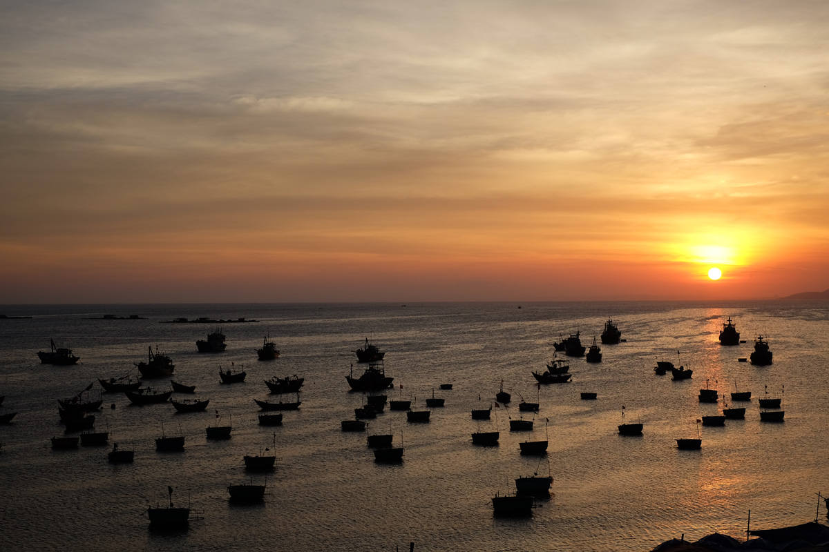 ขับมาจากโรงแรมประมาณ 3 โล ก็ถึงหมู่บ้านชาวประมง โชคดีมาก มาถึงตอนพระอาทิตย์กำลังจะตก เป็นวิวที่สวยมาก จุดแปลกของที่นี่คือ เรือตกปลา ที่มีลักษณะเหมือนกะละมังใบใหญ่ นั่งชมวิวกันสักพักก็ขี่จักรยานไปต่อ