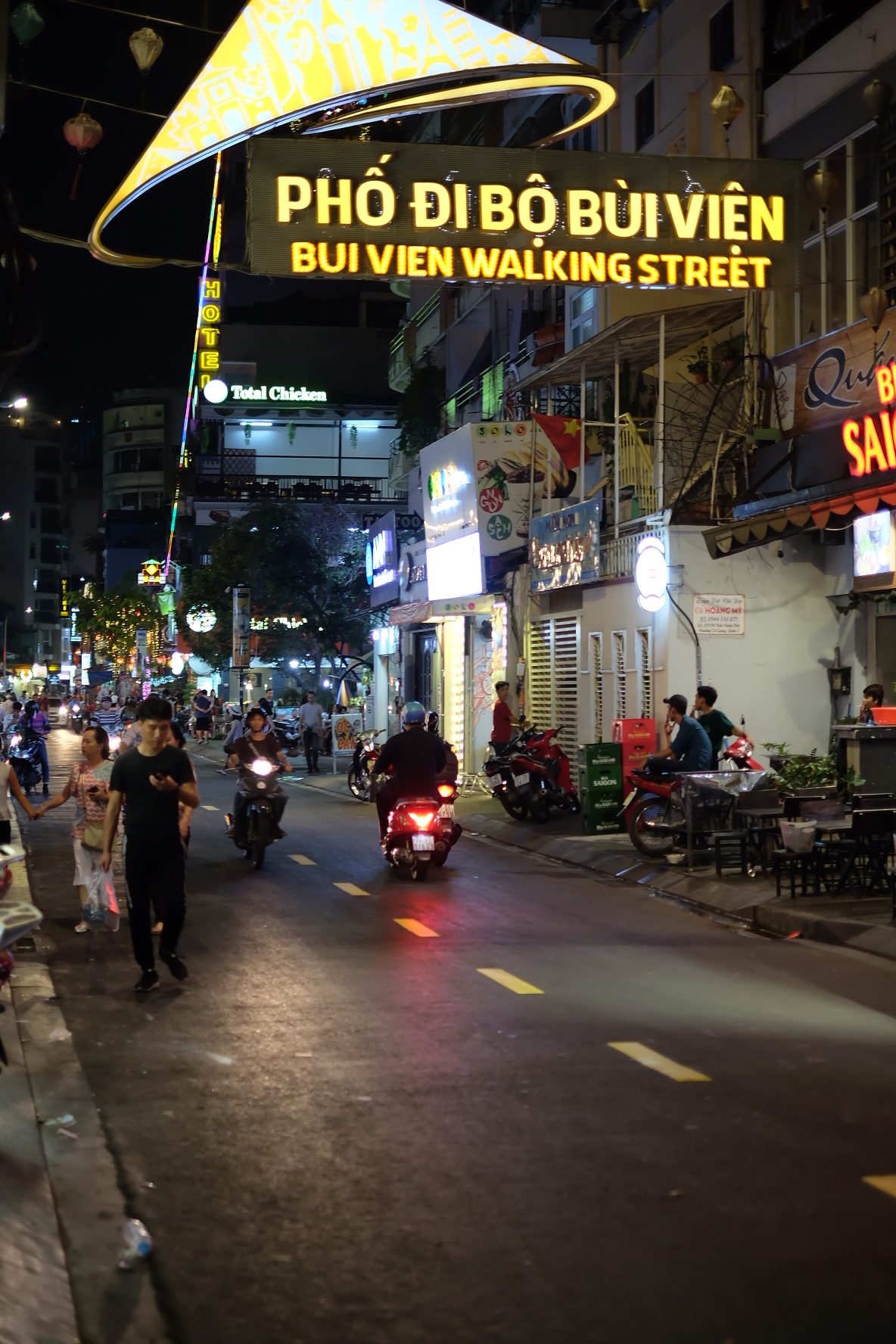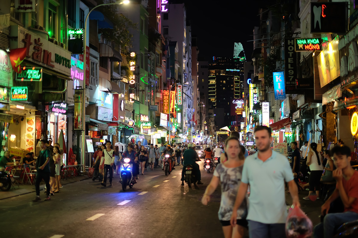 หลังจากนั้นเรานั่ง Uber ต่อไปที่ Pham Ngu Lao ซึ่งเป็นย่านที่มีลักษณะเหมือนถนนข้าวสารของบ้านเรา Bui Vien Walking Street ที่เราเดินผ่าน เต็มไปด้วยบาร์และร้านอาหาร ตอนแรกกะว่าจะหาอะไรกินเล็กๆน้อยๆแถวนี้เพราะยังอิ่มจากมื้อกลางวันอยู่ แต่ก็ดูไม่มีอะไรน่ากิน