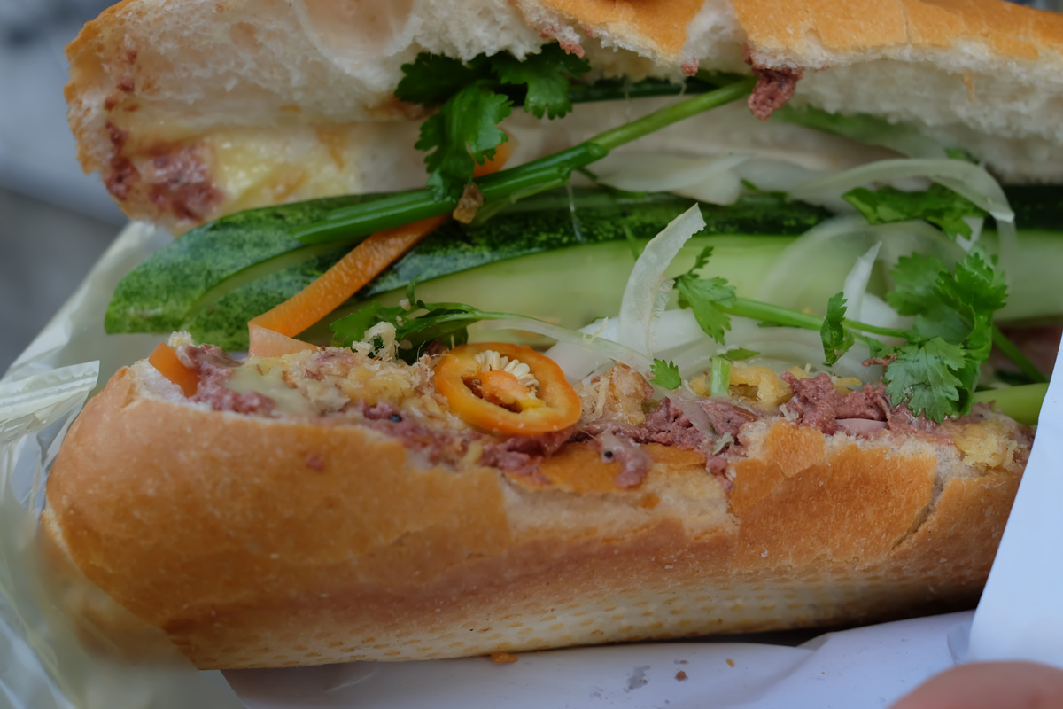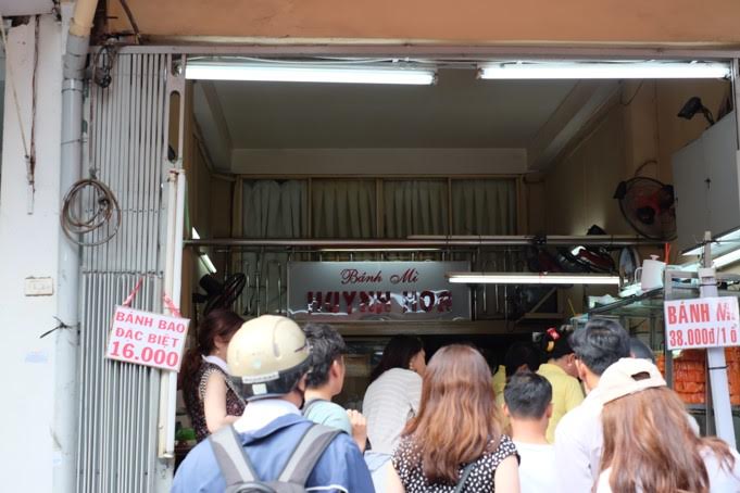 นั่งรถมาประมาณชั่วโมงกว่า ก็กลับมาถึง HCMC ตอนบ่าย 3 เราจึงแจ้งไกด์ว่าขอไปลงที่ร้าน Banh Mi Huyn Hoa เป็นร้านขายขนมปังฝรั่งเศสใส่ไส้ มีตับบด แฮม ผักต่างๆ ร้านนี้ถือเป็นร้านที่เราต้องต่อคิวและใช้เวลารอนานที่สุดกว่าทุกๆร้านที่ไปมา คือใช้เวลารอนานเกือบครึ่งชั่วโมง ในคิวมีทั้งคนเวียดนามเอง และคนต่างชาติ จริงๆคนทำก็ทำค่อนข้างเร็ว แต่ปัญหาคือมีมอเตอร์ไซต์รับจ้างมารอซื้อ ซื้อทีใส่ถุงไปเป็นร้อยๆอัน เลยทำให้เราต้องรอนาน หลังจากที่มอเตอร์ไซต์รับจ้างได้รับของไป 2-3 คน แถวก็เริ่มเคลื่อนอย่างรวดเร็ว จนในที่สุดได้ก็ถึงคิว Banh Mi อันละ 38,000 ดอง รสชาติอร่อยใช้ได้เลยทีเดียว