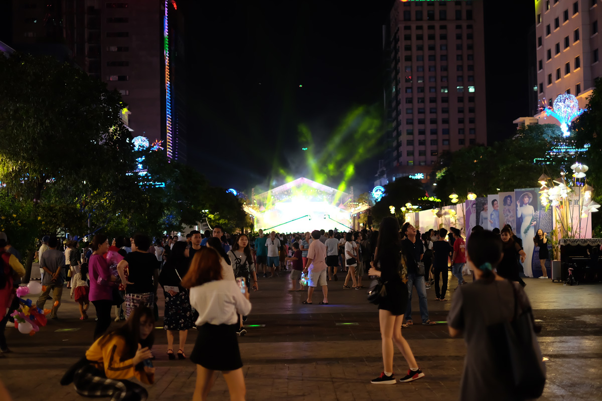 พอกินเสร็จก็นั่งรถกลับไปที่โรงแรม เดินไปถาม Reception โรงแรมว่ามีที่เที่ยวย่านกลางคืนตรงไหนบ้าง Reception ที่ดูไม่ค่อยอยากตอบอะไรก็บอกว่าให้เดินไปจากโรงแรมไป 1 Block มี Walking Street อยู่ พวกเราก็งงๆ คิดว่าเดินไปก็มีแต่ถนนเส้นเดิม พอเดินมาถึงเข้าใจว่าทำไมเค้าถึงให้มา Nguyen Hue ได้เปลี่ยนเป็นถนนคนเดินเต็มรูปแบบ คือปิดไม่ให้รถผ่านเลย ไม่แน่ใจว่าเป็นเพราะมี Ao Dai Festival 2018 อยู่รึป่าว หรือเป็นเพราะปกติก็ปิดถนนตอนกลางคืนอยู่แล้ว บรรยากาศโดยรอบคึกคัก คนเวียดนามออกมาเดินกันเต็มถนน โดยเฉพาะเด็กวัยรุ่น ตรงเวทีบริเวณจัดงานก็จะมีการแสดงดนตรี สลับกับการแสดง และแฟชั่นโชว์ ก็ถือว่าโชคดีที่ได้เดินมาดู อีกเรื่องนึงที่งงก็คือ ป้าย Happy New Year 2018 ที่ไม่แน่ใจว่าเกี่ยวข้องกับช่วงเวลาที่ไปรึป่าว เพราะในเมืองยังมีป้ายนี้อยู่เต็มไปหมด ประกอบกับตอนที่เรามาถึง HCMC วันแรก คนขับรถก็พยายามพูดว่าตอนนี้คือปีใหม่ แต่พอลองหาดูใน Google ก็เห็นว่าเวียดนามก็ใช้ Lunar New Year ที่ตรงกับเรา เลยไม่แน่ใจว่ามันปีใหม่จริงๆรึป่าว