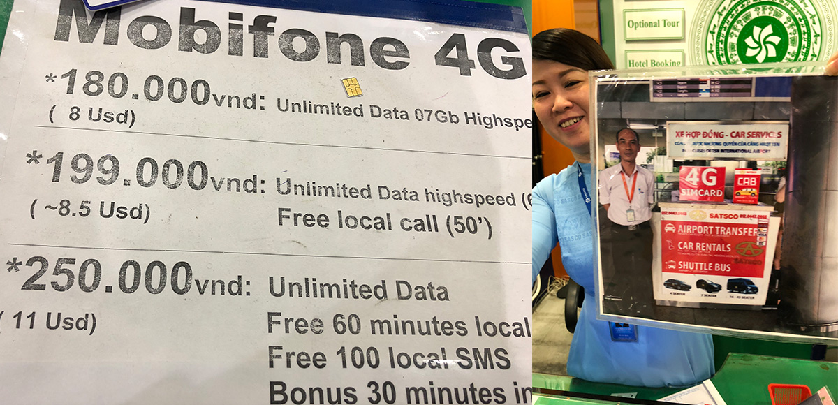สิ่งแรกที่คิดไว้ว่ามาถึงแล้วต้องทำก็คือการซื้อซิมการ์ดซึ่งพอเดินผ่านศุลกากรออกมา ก็มีป้ายติดขายซิมการ์ดอยู่หลายร้านเรียงรายกันอยู่ในสนามบิน เราเดินมองดูป้ายเพื่อสำรวจราคากันก่อน โดยอ่านรีวิวมาแล้วว่าจะซื้อของ Mobifone ยังไม่ทันจะเดินสำรวจครบทุกร้าน มีเจ๊ผู้หญิงคนนึงก็ตะโกนเรียกพวกเราจากในร้านว่าจะซื้อซิมการ์ดรึป่าว ที่นี่มีขายนะ พร้อมกับยื่นป้ายราคาให้ดู แต่เรื่องราคาก็ไม่รู้หรอกนะว่าถูกหรือแพงเพราะตอนดูรีวิวไม่ได้จำราคามา แต่ก็เป็นอันตกลงซื้อไปเรียบร้อยที่ราคา VND199,000 (หน่วยเงินที่นี่เวลาเค้าเรียกกันจะตัดศูนย์ 3 ตัวหลังออกเพื่อความสะดวก) ระหว่างที่ยืนรอให้เจ๊เปลี่ยนซิมให้ เจ๊ก็ใช้ความสามารถในการขายของ ชวนพวกเราคุยว่านี่จะไปไหนกันหรอ ที่นี่ก็มีบริการแท๊กซี่นะ เราเลยตอบไปว่าจะไป Muine เค้าก็บอกว่านี่เดี๋ยวเค้าลดราคาให้ เพราะพวกเราซื้อซิมกับเค้า เค้าก็คิดให้ดูเป็นแบบรายคนว่าเนี่ยปกติคนละ 100 กว่าเหรียญ เนี่ยลดให้ 20% เหลือคนละเท่านี้เหรียญ แล้วก็ลดให้อีกคนละ 1 เหรียญนะ เพราะว่าพวกเราซื้อซิมไป ตกออกมาคันละ USD87 เราก็จำได้ว่าตอนอ่านมาจากพันทิพราคาจะตกอยู่ประมาณ USD80-90 เราก็อยากได้ถูกที่ USD80 เลยลองต่อไปว่าลดให้ดีอีกรึป่าว แต่เจ้ก็บอกว่าไม่ได้แล้ว นี่เป็นการลดให้สุดๆแล้ว ให้ลองเดินถามแถวนี้ตกไหนดูก็ได้ ไม่มีตรงไหนถูกกว่านี้แล้ว พวกเรามองซ้ายมองขวา ให้เพื่อนเดินไปถามร้านข้างๆเค้าบอกว่าคิดที่ USD110 (แต่นี้ก็คือยังไม่ได้ต่ออะไรนะ) พวกเราด้วยความขี้เกียจ ประกอบกับท่าทางที่น่าเชื่อถือของเจ้ ก็ขี้เกียจไปเดินให้คนอื่นหลอก ก็เลยตกลงกับเจ้เรียบร้อย ซึ่งราคานี้เป็นราคาแค่ส่งอย่างเดียว ไม่รวมพาไปเที่ยวที่อื่น แต่สามารถขอคนขับพักกินข้าวหรือเข้าห้องน้ำระหว่างทางได้ สรุปว่าจ่ายเงินให้เจ้ค่ารถไปทั้งหมด 2 ล้านดอง สรุปแล้วแฟนบอกว่าที่เจ้บอกว่าลดให้เหรียญนึง จริงๆคือไม่ได้ลดอะไรให้หรอก เพราะว่าตอนถอนตังค่าซิมถอนมาไม่ครบ ที่ลดราคาไปก็คือตังทอนค่าซิมนั่นเอง เราก็งงไปเลยเห็นเจ้พูดหลายรอบซะดิบดี แต่ก็ไม่เป็นไร ถือว่าได้ความสบายใจจากหน้าตาของเจ้ เจ้รับเงินเรียบร้อยก็ชี้ทางพร้อมยกรูปขึ้นมาโชว์ว่าออกจากสนามบินให้เดินไปทางขวาหน้าประตูที่ 3 จะเจอบู๊ธแบบในรูปให้เอาใบเสร็จรับเงินไปยื่นแล้วรอรถที่ตรงนั้น