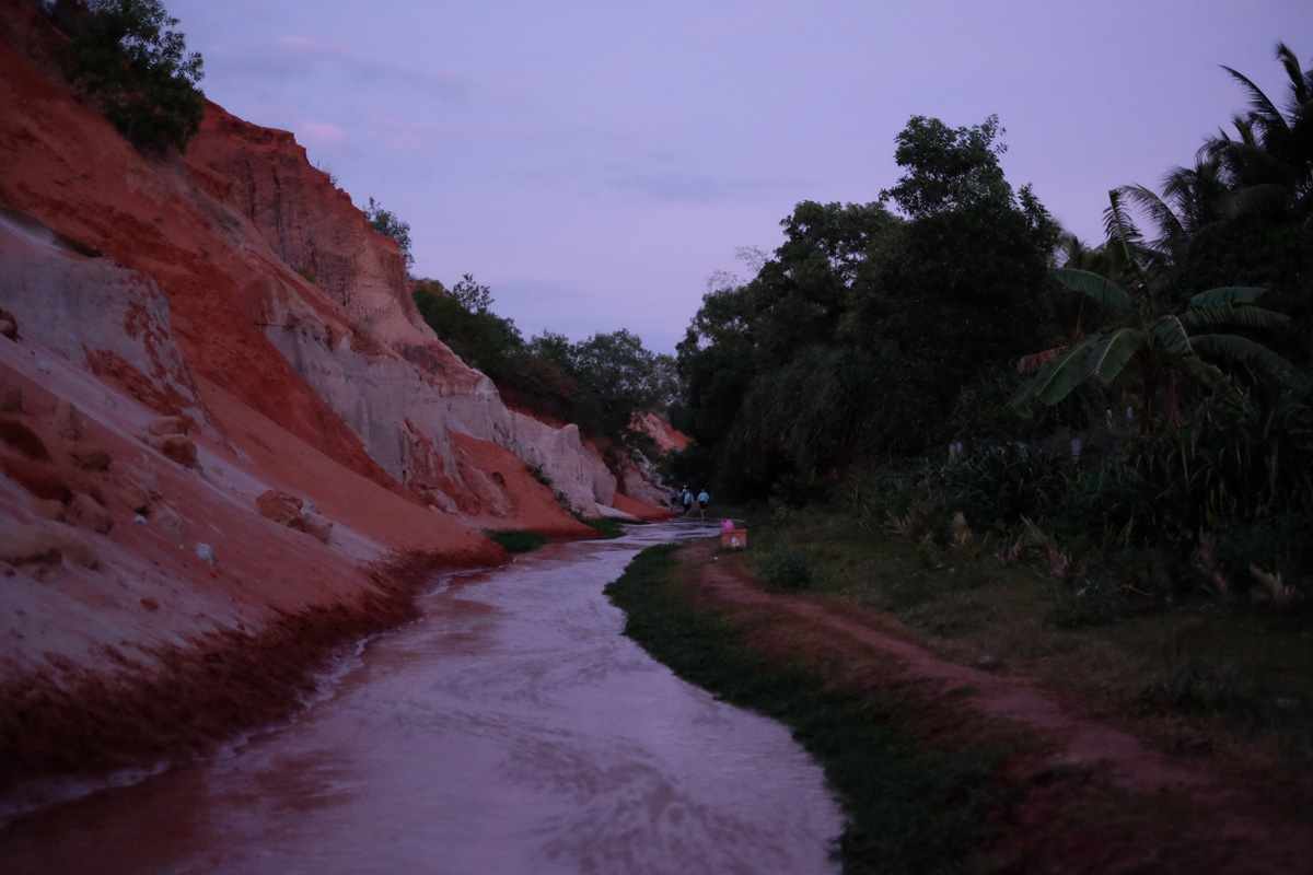 ไปต่อถึงอีก 2 กม. ก็ถึง Fairy Stream จุดนี้มีเสียค่าเข้า จริงๆมีราคาติดอยู่คนละ 10,000 ดอง แต่คนเฝ้าบอกว่าเอาจักรยานมาคิดเพิ่มเป็นคนละ 15,000 ดอง ก็ไม่รู้ว่าจริงหรือถูกโกง มาถึงที่นี่ฟ้าเริ่มมืดลงแล้ว พวกเราก็เดินไปเรื่อยๆ ทางเดินจะมีน้ำไหลผ่านตลอด ถอดรองเท้าเดินได้เพราะพื้นเป็นเหมือนทรายนิ่มๆ ระหว่างเดินก็เจอคนที่เดินเข้าเหมือนกันอยู่แค่กลุ่มเดียว ส่วนใหญ่จะสวนกันกับคนที่เดินกลับมา ด้วยความที่ไม่ได้ดูมาก่อนว่าทางเดินยาวแค่ไหน ก็เริ่มไม่แน่ใจว่าควรเดินต่อไปรึป่าว เพราะมันมืดลงเรื่อยๆ ความโชคดีก็คือ วันนี้เป็นวันพระจันทร์เต็มดวง ทำให้ถึงมืดยังไง ก็ยังพอเห็นทางเดินอยู่บ้าง เดินๆไปจนเริ่มไม่เห็นคนกลับมา จึงดูใน Google Map เหมือนว่าพวกเราจะเดินกันได้มาเกินครึ่งทางแล้ว อยากเดินกันไปให้สุดทาง เพราะระหว่างทางถามฝรั่งกลุ่มนึงเค้าบอกว่าจะมีช่วงที่น้ำขึ้นมาถึงเอวเลย ถ้าดูตามแผนที่ เข้าใจว่ามันจะเป็นทางที่ตัดไปออกทะเลเลย แต่จากที่ดูคิดว่ามันอาจจะต้องเดินไปอีกประมาณ 15 นาที พอคำนวณเวลาไปกลับ คิดว่าไม่น่าจะไหว เพราะทางค่อนข้างมืด เลยตัดสินใจกลับกันออกมา ระหว่างทางกลับไม่เจอใครเลย เดินๆมาสักพักเจอฝรั่ง 2 คน ซึ่งโชคดีที่เค้ามีไฟฉาย เราเลยเดินตามเค้ากลับมา จนถึงที่ๆจอดจักรยานไว้ ระหว่างเดินคุยกับแฟนว่าจะเช่ารถขนจักรยานขึ้นกลับดีมั๊ย แฟนบอกว่าตามใจ แต่คิดว่าน่าจะต้องโดนสักล้านดอง ด้วยความงกแถมกับความขี้เกียจสื่อสาร เราเลยตัดสินใจยอมขี่กลับโรงแรม ขากลับก็ขี่กลับสบายๆกว่าขามา เพราะรถเริ่มน้อยและอากาศเย็นกว่าตอนขามามาก มีจุดเดียวที่ลำบากคือ มีจุดขึ้นเนินยาว ซึ่งอันนั้นเราขี่ได้ครึ่งทาง ก็ต้องลงมาเข็นจักรยานขึ้นเนิน เรียกว่ากว่าจะกลับมาถึงโรงแรม เล่นเอาหอบเลยทีเดียว