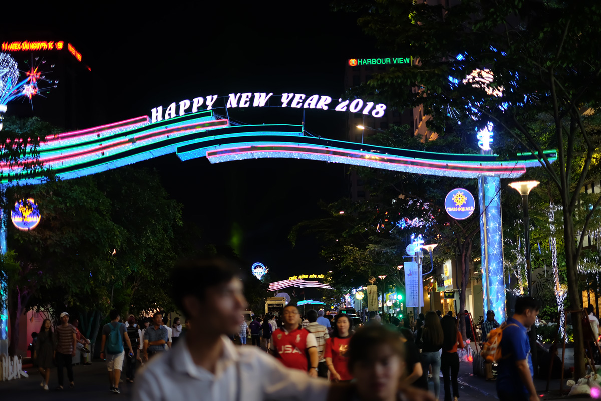 พอกินเสร็จก็นั่งรถกลับไปที่โรงแรม เดินไปถาม Reception โรงแรมว่ามีที่เที่ยวย่านกลางคืนตรงไหนบ้าง Reception ที่ดูไม่ค่อยอยากตอบอะไรก็บอกว่าให้เดินไปจากโรงแรมไป 1 Block มี Walking Street อยู่ พวกเราก็งงๆ คิดว่าเดินไปก็มีแต่ถนนเส้นเดิม พอเดินมาถึงเข้าใจว่าทำไมเค้าถึงให้มา Nguyen Hue ได้เปลี่ยนเป็นถนนคนเดินเต็มรูปแบบ คือปิดไม่ให้รถผ่านเลย ไม่แน่ใจว่าเป็นเพราะมี Ao Dai Festival 2018 อยู่รึป่าว หรือเป็นเพราะปกติก็ปิดถนนตอนกลางคืนอยู่แล้ว บรรยากาศโดยรอบคึกคัก คนเวียดนามออกมาเดินกันเต็มถนน โดยเฉพาะเด็กวัยรุ่น ตรงเวทีบริเวณจัดงานก็จะมีการแสดงดนตรี สลับกับการแสดง และแฟชั่นโชว์ ก็ถือว่าโชคดีที่ได้เดินมาดู อีกเรื่องนึงที่งงก็คือ ป้าย Happy New Year 2018 ที่ไม่แน่ใจว่าเกี่ยวข้องกับช่วงเวลาที่ไปรึป่าว เพราะในเมืองยังมีป้ายนี้อยู่เต็มไปหมด ประกอบกับตอนที่เรามาถึง HCMC วันแรก คนขับรถก็พยายามพูดว่าตอนนี้คือปีใหม่ แต่พอลองหาดูใน Google ก็เห็นว่าเวียดนามก็ใช้ Lunar New Year ที่ตรงกับเรา เลยไม่แน่ใจว่ามันปีใหม่จริงๆรึป่าว